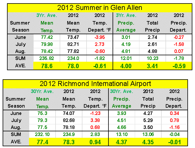 Glen Allen - Lowell adds these notes: " August was just a little cooler than average as the monthly mean temperature was 77.8° F, a +0.6°F mean temperature departure based on a three-year average, and was wetter than average. This was the coolest August since 1968. The 4.88 inches of rain for August was a +0.07 inch departure based on a three-year average and the wettest month since September of 2011 when 6.51 inches was recorded. It was also the 2nd wettest August on record. (Records since July of 2008). The maximum rainfall recorded in a day was 1.35 inches on the 2nd and measurable precipitation occurred on 13 days, the greatest on record for August. The maximum temperature for August was 95°F on the 31st. On 12 days the maximum temperature was greater than or equal to 90°F. The lowest minimum was only 63°F recorded on the 16th and 22nd. The maximum wind gust was 33 mph from the SSW that occurred on the 2nd at 1556 hours. The Richmond International Airport (KRIC) had only 3.50 inches of rain for August, the 85th wettest August in the past 140 years. KRIC had an August mean temperature of 78.2°F which was the 34th warmest August in the past 132 years. They tied only one record for the date. On Aug. 5th, the highest minimum temperature for the date was 75°F, which tied with 1989 and 1915. Before drawing too many conclusions between these tables, note Glen Allen has a three-year average and the Richmond International Airport has a 30-year average. KRIC had 2.83 inches more precipitation than Glen Allen and averaged 0.3°F warmer. However, in August KRIC had 1.38 inches less precipitation than Glen Allen. " - [ - + ] "