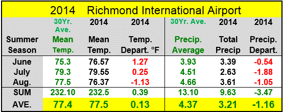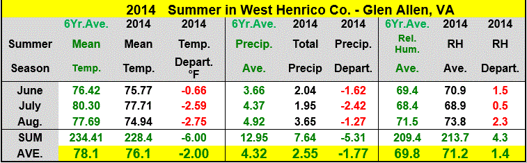 Raleigh - from contributor Bob Woodson (RAL): " A VERY COOL AUGUST WITH THE AVERAGE DAILY TEMPERATURE OF 74.3 DEGREES WHICH IS 4.2 DEGREES BELOW NORMAL THERE WERE ONLY 5 DAYS THAT HAD MAXIMUM TEMPERATURES THAT WERE AT LEAST 90 DEGREES. AUGUST RAINFALL WAS 0.05” ABOVE NORMAL AND 6.23” ABOVE NORMAL FOR 2014. THUNDERSTORMS WERE OBSERVED ON 3 DAYS. " - [ - + ]