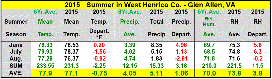 Glen Allen - from Lowell Koontz: " The monthly mean temperature for August was 76.4 °F, a -0.9 °F mean temperature departure based on a seven-year average and the third lowest on record. The 1.83 inches of rain for August was a negative 2.91 inch departure based on a seven-year average and the driest August on record. The most rainfall in a calendar day was 0.61 inches, in 24 hours was 0.92 on the 9th and 10th and in one hour was 0.26 inches which were all record low amounts. The month had 8 precipitation days the second least number of days on record. The maximum temperature for August was only 95°F on the 4th. The lowest minimum was 59°F recorded on the 28th. The maximum wind gust was only 23 mph on the 4th as there were no strong thunderstorms. Thunder was only heard 3 days which tied for a record minimum. Before drawing too many conclusions between these tables, note Glen Allen has a six-year average and the Richmond International Airport uses a 30-year average. The six year average temperature of this station includes the very hot summers of 2010 and 2011. It is interesting that Glen Allen had the wettest June and the second wettest July followed by the driest August on record. August was 1.82 inches drier than the previous driest August and had a -2.91 inch departure from the average. Thus the summer was cooler than average with an average departure of negative 0.8°F. August was also wetter than average with a +1.06 inch departure and a departure of +3.8% relative humidity. " - [ - - ]