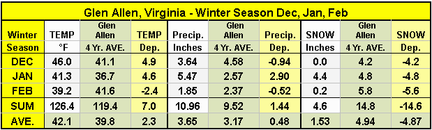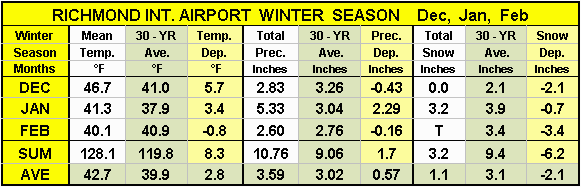 Richmond - from Lowell Koontz in nearby Glen Allen: " The Richmond International Airport had no daily records this month. Their highest maximum temperature was 63 °F on the 11th and 15th; only 12 years since 1897 have had a lower maximum temperature for the month. Using the new recalculated mean temperatures from 1880 to 1896 this winter was the 15th warmest since 1880, which is mostly because December 2012 was the 6th warmest December on record. This was a seasonal departure of +2.8 °F. The Airport had a -3.4 inch snow deficit for the month and 6.2 inch deficit for the winter. " - [ - - ]