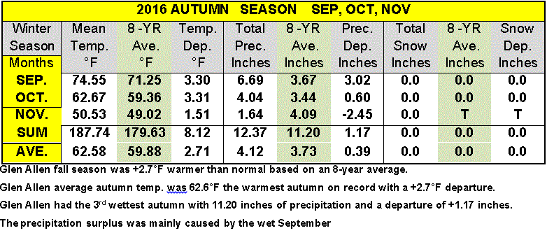 Glen Allen - from Lowell Koontz (GAV): " This November was the second driest on record (records since 2008) as the monthly precipitation was 1.64 inches, a negative 2.45 inch departure when compared with Glen Allen’s eight year average. Precipitation occurred on 8 days in November and the month was the second clearest on record. The maximum temperature for November was 84.1°F on the 3rd which was a new record monthly maximum and surpassed the old record by +5°F and set a new heat index for November. The daily mean temperature on the 3rd was 70.9°F which tied the record for the warmest November day on record at Glen Allen. This was also the first temperature above 80°F for November. The month had 3 days with the maximum temperature of = 75°F. The lowest minimum was 21.8°F recorded on the 22nd. There were 9 days that the minimum temperature was less than or equal to 32°F which was near the average. The clear days of November gave large daily temperature ranges and set 7 daily high records and the average range of 26.1°F set a new high record average for November. The 39°F temperature range on the 13th also tied the record high for November. The maximum barometer reading for the month was 30.50 inches occurring on the 7th. The highest dew point for the month was 65°F on the 2nd which was average for November. The maximum wind gust was only 35 mph on the 29th which tied the record high wind gust for November. " - [ + - ]