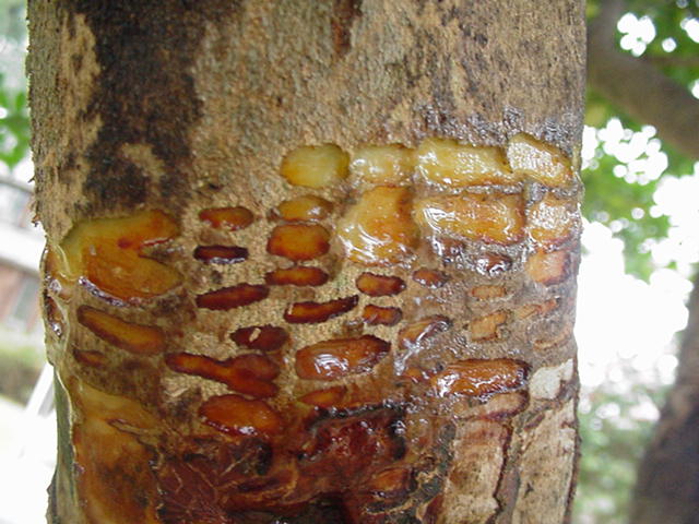 The disease is characterized by sudden wilting of new growth, particularly in early summer. The leaves characteristically cling to the branches for a considerable length of time after they die. Cankers can sometimes be seen at the infection point, and these may ooze pink masses of fungal spores during extended periods of wet weather.