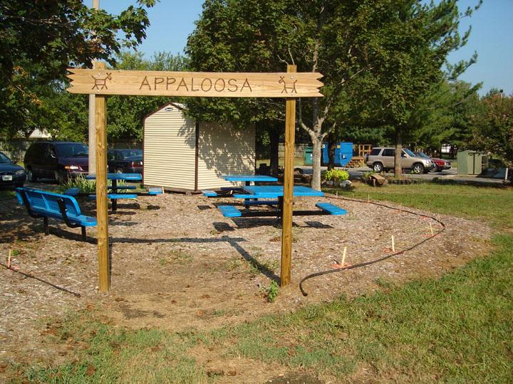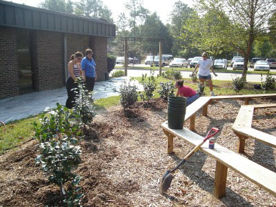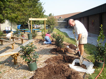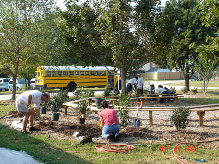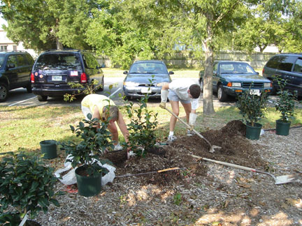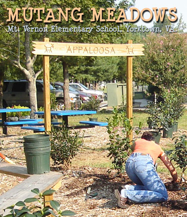 In September 2005, forty-two camellias were planted by parent volunteers in the Mustang Meadows Learning Garden at Mt. Vernon Elementary School in Yorktown, VA. The shrubs will eventually create hedges around the two outdoor classrooms within the garden. The Virginia Camellia Society worked with PTA volunteers to provided the expertise in choosing and planting four varieties: Our Linda, Destiny, Tri Color, and Jerry Hill. The plants should provide colorful blooms while the children are in school to enjoy them.The people who were instrumental in planting the Camellias: Principal Jane Allen-Houk who backed and supported the camellias, former PTA President Margo LaMarsh and current PTA President Belinda Williams who supported and funded the project through PTA funds; PTA parents/York County Master Gardeners, Jody Turner, Michelle Gazarik, and Clare Britcher; and Sara Hartian PTA Parent and Mustang Meadows committee member who helped to oversee the planting.